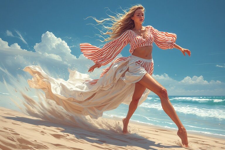 Nina decided that shoes were overrated the moment her toes touched the warm beach sand. Barefoot and fearless, she took off running along the shoreline, her striped long-sleeve top fluttering in the sea breeze like it had a life of its own. The ocean looked impressed. The sand, however, had other plans.