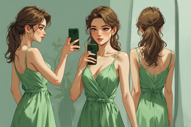 She started with a slow turn, letting the green fabric sway just enough to catch the reflection in the mirror. One hand held the phone, the other grazed her waist, fingers lightly tracing the dress as if emphasizing every curve. Her eyes sparkled as she checked the camera, ensuring the shot was playful yet elegant.